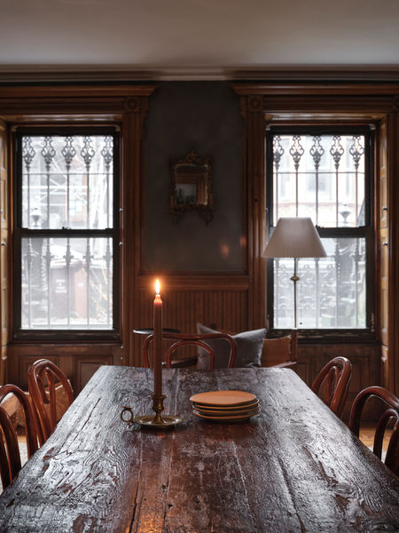Designed and styled by Mariah Rich, this 1899 brownstone tells a story of time, texture, and thoughtful restraint. Every room was approached as a study in contrasts - original millwork and plasterwork set against vintage lighting, collected furnishings, and the soft patina of age.